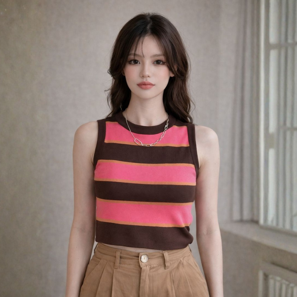 Wil jij een topje dat zowel casual als elegant te dragen is? Het Eline mouwloze gebreide topje met strepen en een flatterende sanduursnit is jouw nieuwe favoriet. Dankzij het zachte katoen en het stijlvolle gestreepte patroon straal je moeiteloos klasse en vrouwelijkheid uit. Ideaal te combineren met high-waist broeken of rokken!